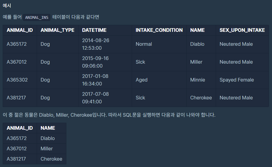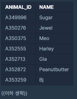 동물 보호소에 들어온 동물 중 젊은 동물의 아이디와 이름을 아이디 순으로 출력하는 문제이다.