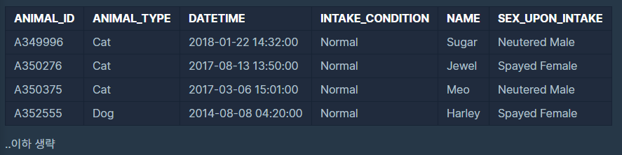 각각 동물의 아이디, 생물 종, 보호 시작일, 보호 시작 시 상태, 이름, 성별 및 중성화 여부를 나타낸 것이다.