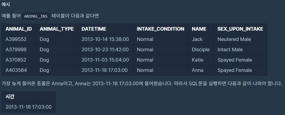 동물 보호소에 가장 최근에 들어온 동물이 언제 들어왔는지 출력하는 문제이다.